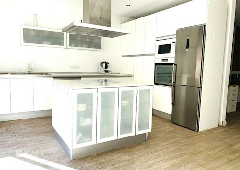 Die offene Küche im amerikanischen Stil fügt sich nahtlos in den Wohnbereich ein und verbindet Funktionalität mit mediterranem Charme – perfekt für Genießer und gesellige Abende.