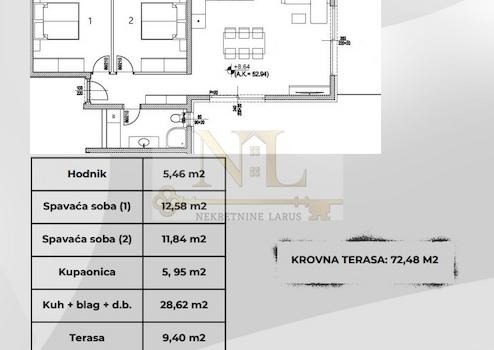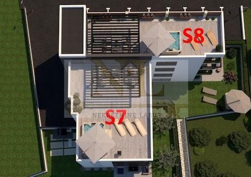 Die Penthousewohnung S8 mit Dachterrasse besteht aus zwei Schlafzimmern, einer Küche mit Wohnzimmer, einem Badezimmer sowie einem Balkon und einer dazugehörigen Dachterrasse.