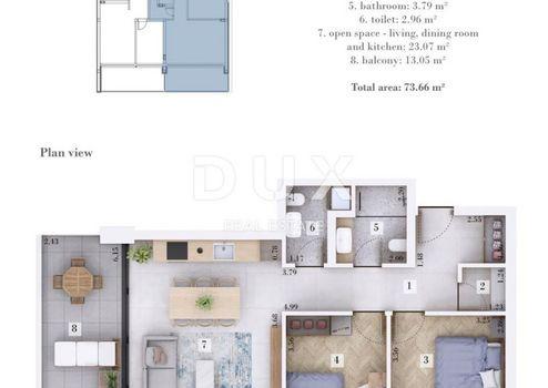 Wir präsentieren stolz dieses hochwertige und luxuriöse Neubauprojekt, das nur 2 Autominuten vom Zentrum des Dorfes Rovinj entfernt liegt. Dies ist ein Projekt neuer kleinerer Wohngebäude, die sich in ruhiger Lage befinden, nur 2 Minuten von allen notwendigen Annehmlichkeiten und nur 10 km von der unvermeidlichen Stadt Rovinj entfernt. So haben wir in diesem Projekt das Vergnügen, Ihnen eine komfortable, geräumige und sonnige Wohnung im 1. Stock des Gebäudes präsentieren zu können, die ihren zukünftigen Eigentümern alles bietet, was sie für einen unvergesslichen Aufenthalt, maximalen Komfort und ein hohes Maß an Luxus benötigen. WOHNUNGSBESCHREIBUNG: Die Wohnung besteht aus insgesamt 73,66 m2 Wohnfläche, dazu gehören auch zwei Parkplätze, alles im sichtbaren Preis der Wohnung enthalten. Beim Betreten der Wohnung gibt es einen Flur mit einem dafür vorgesehenen Platz für eine Garderobe, der uns dann in den Wohnbereich der Wohnung führt. Hier haben Sie die Möglichkeit, Ihre Zeit in einem „Open Space“-Bereich ohne Trennwände zu verbringen, in dem eine moderne Küche, ein Esszimmer und ein gemütliches Wohnzimmer Platz bieten. Was diesen Teil der Wohnung schmückt, sind die großen Glasschiebewände, die viel natürliches Licht in die Wohnung lassen und auch als Zugang zum 13,05 m² großen, überdachten Außenbalkon dienen. Dieser überdachte Balkon ist ideal, um Ihren Morgenkaffee zu trinken, sich anschließend zu entspannen oder tagsüber mit Familie und Freunden zu unterhalten sowie abends ein Glas Ihres Lieblingsweins zu genießen. Die Wohnung verfügt außerdem über 2 gemütliche Schlafzimmer, ein großzügiges Badezimmer und ein zusätzliches Gäste-WC, zudem ist ein interner Abstellraum vorhanden. Zur Wohnung gehören außerdem 2 gesicherte Parkplätze. Auf dem Grundstück sind drei Ladegeräte für Elektrofahrzeuge geplant, die den künftigen Besitzern eine praktische und umweltverträgliche Lösung zum Aufladen ihrer Autos bieten. ZUSÄTZLICHE WOHNUNGINFORMATIONEN: * Der angegebene Preis enthält die Mehrwertsteuer für Einzelpersonen, während der Preis für juristische Personen (Unternehmen) um 25 % Mehrwertsteuer reduziert wird. * Hochwertige Ausstattung und Materialien * Heizen und Kühlen: Multi-Split Heiz- und Kühlsystem. In der gesamten Wohnung kann auf Wunsch des Käufers eine Fußbodenheizung im Bad und in der Küche installiert werden. * Bodenbelag: Italienische Fliesen in der gesamten Wohnung, außer im Schlafzimmer, wo Holzboden verlegt ist. * Tischlereiarbeiten: Große Glasportale bestehen aus weißer PVC-Tischlerei mit anthrazitfarbener Aluminium-Außenverkleidung. Dreifachverglasung und Aluminium-Rollläden mit elektrischen Aufzügen. Die Balkontüren sind Hebe-Schiebetüren. * Innendetails: Der abgesenkte Teil der Decke in der Nähe des Glasportals verbirgt das Gesims und trägt zur eleganten Erscheinung des Raumes bei. * Boiler: Inverter der Klasse A für sanitäres Warmwasser im Bad und in der Küche. * Wasserhähne: Hans Grohe oder Grohe – Top-Qualität und modernes Design. * Sanitärkeramik: Einbauspülkasten, WC und Waschbecken von Grohe, Geberit oder gleichwertiger Qualität. ZUSÄTZLICHE GEBÄUDEINFORMATIONEN: * Hochwertige Bauweise und moderner Stil der Fassade mit Steinverkleidung * Die Fassade des Gebäudes besteht aus 10 cm dickem Demit, mit dekorativen Steinelementen gemäß den gezeigten Visualisierungen. * Gemeinschaftsbereich: Der Flur des Gebäudes ist mit Granitsteinen ausgelegt, das Geländer besteht aus Schmiedeeisen und hat einen Holzhandlauf, was ihm ein besonders luxuriöses Aussehen verleiht. LAGEBESCHREIBUNG: Die Wohnung befindet sich in einem ruhigen Dorf mit allen notwendigen Annehmlichkeiten in der Nähe, wie zum Beispiel: * Schule – 1,7 km * Supermarkt – 2,4 km * Kindergarten – 1,7 km * Öffentliche Verkehrsmittel – 150 m * Restaurant – 100 m * Ausgezeichnete Verbindungen: Autobahn 5 km, Rovinj 7 km. GEPLANTE TERMINE: *Baubeginn*: 15.03.2025. *Geplanter Fertigstellungstermin*: 01.04.2026. Wenn Sie weitere Fragen haben, notwendige Informationen benötigen oder eine Standortbesichtigung oder ein Treffen mit Investoren vereinbaren möchten, können Sie sich jederzeit an uns wenden.