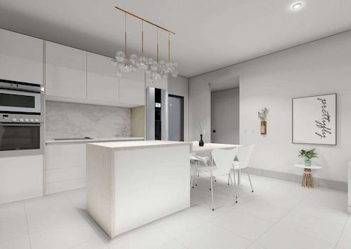 Innen, Küche: Ausgestattet mit geräumigen Hoch- und Tiefmöbeln mit Melanin-Finish, Türen in Weißtönen. Silestone-, Porzellan- oder ähnliche Arbeitsplatten, Unterbauwaschbecken und Einhebelmischer mit hohem Auslauf. Inklusive Geräte: Kühlschrank, erhöhter Backofen, eingebaute Mikrowelle und Dunstabzugshaube. Spülmaschine in der Küche integriert. Tischplatte und Holzinsel.