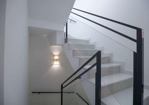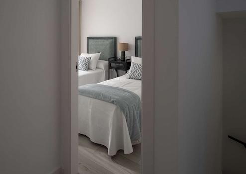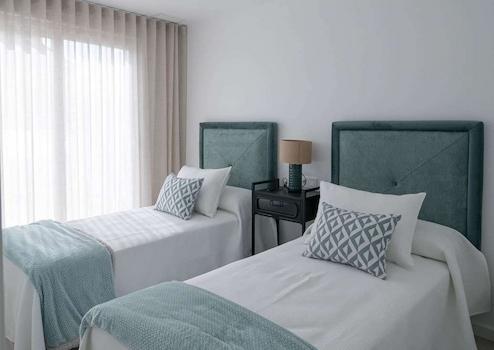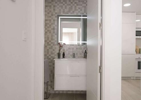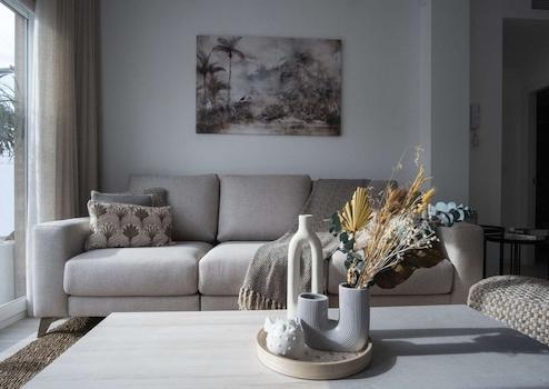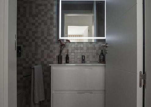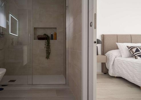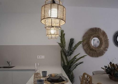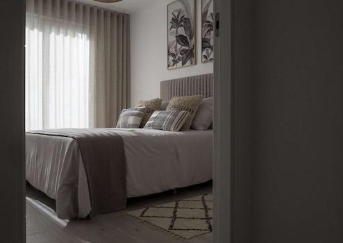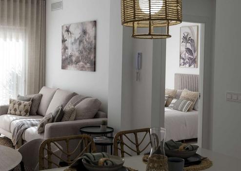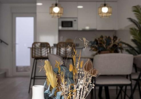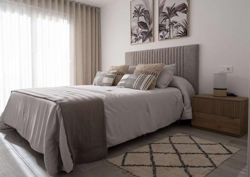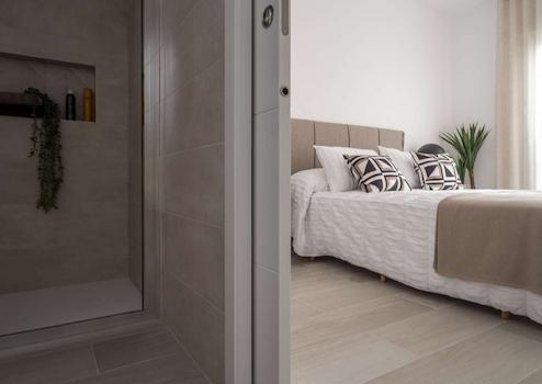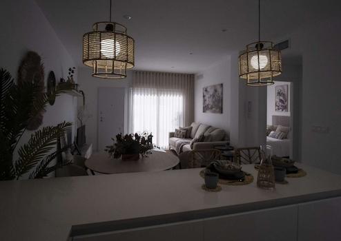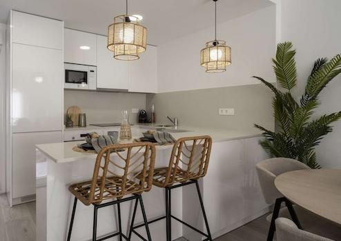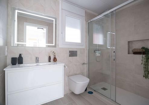 Glatte weiße Kunststofffarbe an Wänden und Decken. Durchgangsbereiche der Einrichtung mit glatter Gipsdecke. Badezimmerdecke mit laminierter Gipskartonplatte mit dekorativem Vinyl. Küche mit glänzend lackierten Türen und Kanten. Scharniere mit Bremse. Blum Motion Schubladenelemente. Arbeitsplatte aus natürlichem Quarz, Silestone oder ähnlichem. Balay-Geräte inklusive (Cerankochfeld, Säulenofen und Mikrowelle, Dunstabzugshaube, Kühlschrank und Geschirrspüler in der Küche integriert)