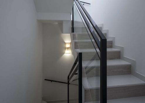 Parkplatz innerhalb des Grundstücks. Flaches begehbares Dach mit Wärmedämmung. Abdichtung mit Asphaltgewebe, veredelt mit Keramiksteinzeug. Zugangstreppe von innen.