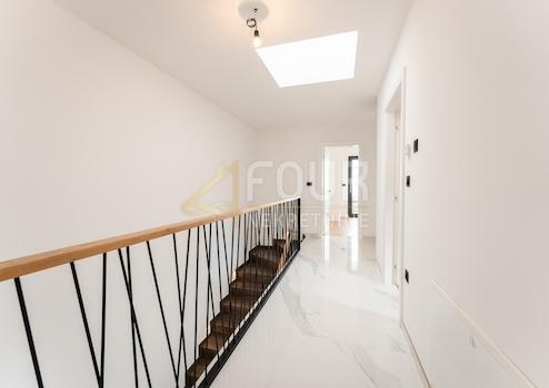 Im Obergeschoss befinden sich drei Schlafzimmer, jedes mit eigenem Badezimmer, und das Hauptschlafzimmer hat Zugang zu einer Loggia mit atemberaubendem Meerblick. Der 103,96 m2 große Garten der Wohnung ist gepflastert und umfasst mehrere Parkplätze.
