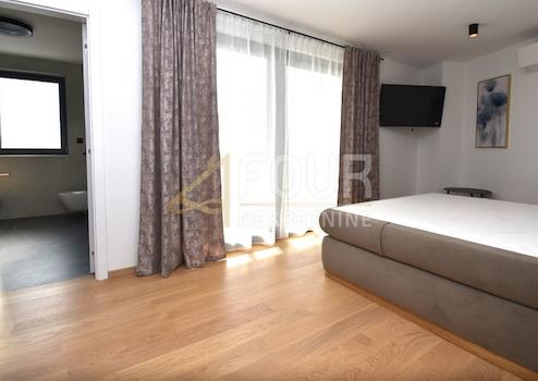 Im ersten Stock befinden sich drei Schlafzimmer, jedes mit eigenem Bad, von denen das Hauptschlafzimmer Zugang zu einer 14,90 m2 großen Loggia mit unglaublichem Meerblick hat. Die Wohnung ist mit Schwerpunkt auf Komfort und Qualität gestaltet und mit erstklassigen Materialien wie dreischichtigem Eichenparkett, hochwertiger Keramik, Sanitärkeramik von Villeroy & Boch und Armaturen von Grohe ausgestattet.