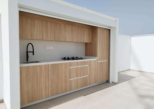 Wasserhähne: Einbau-Einhebelmischer mit Wassersparsystem. Küchenmöbel: Komplett eingerichtete Küche in glänzendem Weiß oder Holzfarbe. Technologische Quarzarbeitsplatte. Spülbecken aus Edelstahl. Inklusive Induktionskochfeld mit integrierter Dunstabzugshaube, Backofen, Mikrowelle, Waschmaschine, integriertem Kühlschrank und integriertem Geschirrspüler. Marke MÍELE.