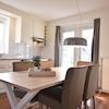 Die Flügeltüren bieten Zugang zur Terrasse und sorgen für einen nahtlosen Übergang von drinnen nach draußen. Der Platz für einen gemütlichen Esstisch macht diese Küche zu einem idealen Ort zum Kochen und Genießen.