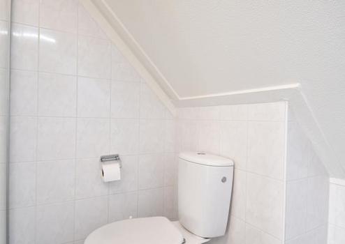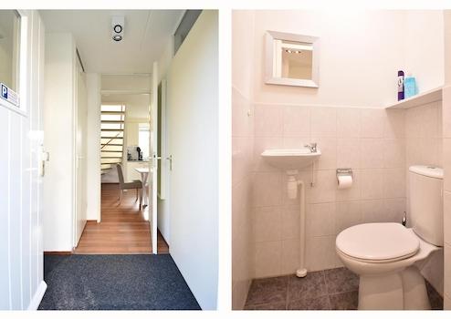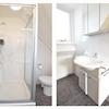 Das Badezimmer ist praktisch und stilvoll mit einer geräumigen Dusche, einem Waschbecken mit Unterschrank und einer Toilette ausgestattet. Die saubere Verarbeitung und die intelligente Aufteilung sorgen für maximalen Komfort und Bequemlichkeit. Ein frischer und funktionaler Raum für einen guten Start in den Tag.