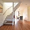 Das Wohnzimmer strahlt dank der großen Fenster, die für viel natürliches Licht sorgen, Raum und Komfort aus. Flügeltüren verbinden den Innenraum mühelos mit der Terrasse, so dass Innen- und Außenbereich nahtlos ineinander übergehen. Die mittig platzierte Treppe verleiht dem Grundriss ein spielerisches Element. Hochwertiges Vinyl ist im gesamten Haus verlegt und sorgt für eine stilvolle und pflegeleichte Oberfläche.