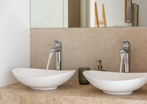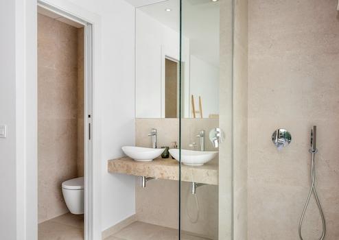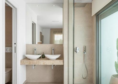 - Hochwertige Steingutfliesen in den Badezimmern.