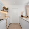 - Hohe und niedrige Küchenoberschränke, weiß lackiert und mit Holzdetails.