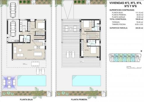 Die Häuser bestehen aus Grundstücken von 385 m², 438 m² und 490 m², wobei 199 m² bebaut sind.