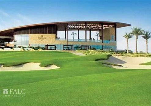 ✅ Aussicht auf den Trump International Golf Club Dubai mit atemberaubendem Blick auf die grünen Fairways.