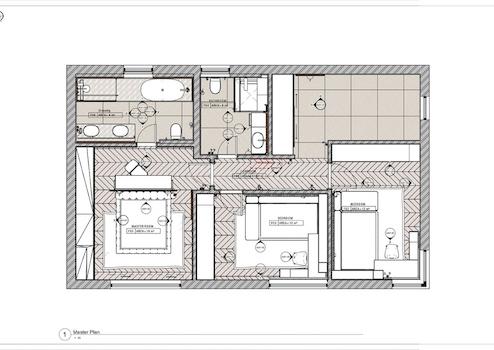 Die Wohnung besteht aus einem geräumigen Flur, einem Hauptschlafzimmer mit grossem Badezimmer sowie zwei weiteren Schlafzimmern und zwei Badezimmern, einer Innentreppe, einem grossen offenen Raum mit Küche, Esszimmer und Wohnzimmer sowie zwei Räumen, die als Abstellräume dienen.