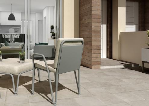 Treppe aus Feinsteinzeug und Geländer aus weiß thermolackiertem Aluminium.