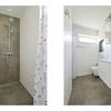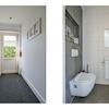 Luxuriöses Badezimmer mit ebenerdiger Dusche, Toilette und Waschbecken.