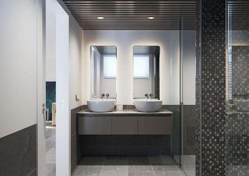 Drei komplette Badezimmer und zwei Toiletten mit hängenden Geräten, Aufsatzwaschbecken und Wasserhähnen mit Thermostat.