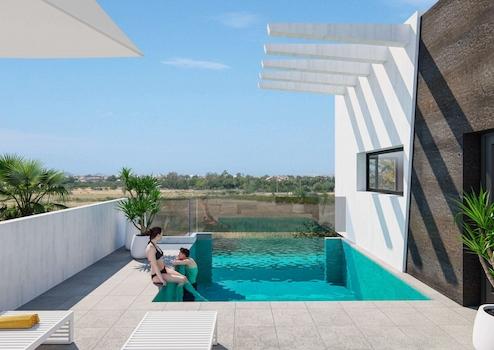 Haushaltsgeräte, Küchenmöbel, Duschwände, Schubladen im Kleiderschrank, Fußbodenheizung in den Bädern, Außenbeleuchtung, Gemeinschaftspool im Preis inbegriffen