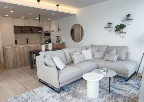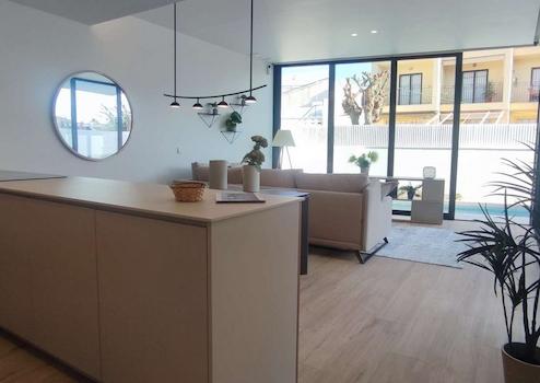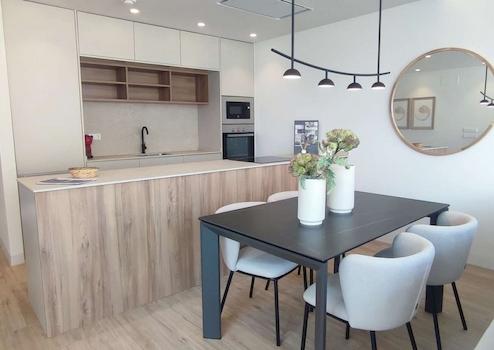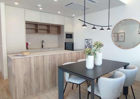 Offene und moderne Küche verbunden mit dem Wohnzimmer, welche mit allen Geräten ausgestattet ist, Herd, Kühlschrank, Geschirrspüler, Backofen usw.