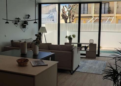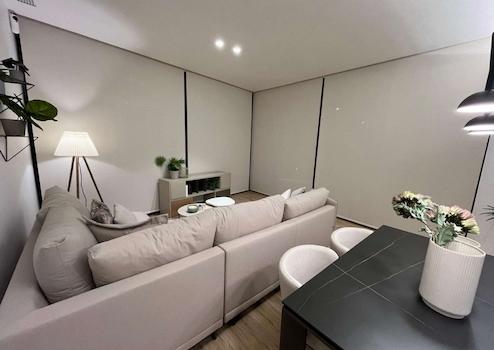 Das Wohnzimmer ist geräumig und lässt dank seiner großen Fenster viel Tageslicht herein.