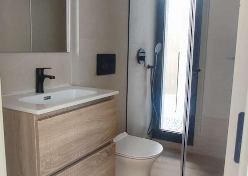 Bodenfliesen aus rektifiziertem Feinsteinzeug in Holzoptik im Innenbereich und in Teilen des Solariums je nach Projekt und Betonoptik im Außenbereich. Feinsteinzeugfliesen in Toiletten.
