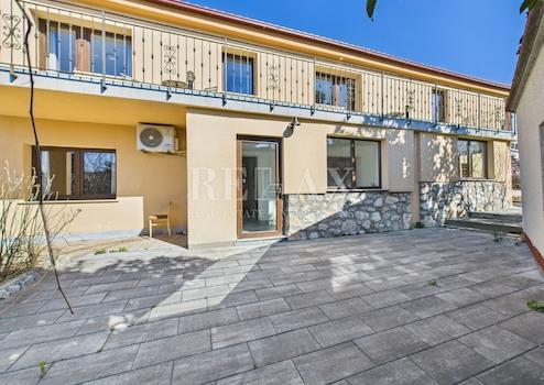 Das gepflegte Grundstück bietet zahlreiche Möglichkeiten zur Entspannung und Geselligkeit. Ein Pool mit Sonnenterrasse, eine überdachte Terrasse für gemütliche Stunden im Freien und eine Grünfläche, die als Garten oder Kinderspielplatz gestaltet werden kann, machen diesen Bereich besonders angenehm. Im Hof gibt es Parkplätze für vier Autos.