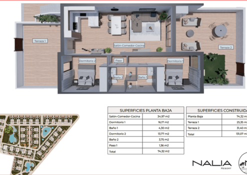 Willkommen in diesem neu gebauten Erdgeschoss-Bungalow, der sich perfekt in die idyllische Umgebung des Naturparks Lagunen von La Mata einfügt. Mit großzügigen 131 m² auf einer Ebene bietet dieses moderne Zuhause alles, was Sie sich wünschen können – 2 stilvolle Schlafzimmer, 2 luxuriöse Bäder und ein lichtdurchflutetes Wohn-Esszimmer, das durch seine offene Gestaltung eine angenehme Weitläufigkeit vermittelt.