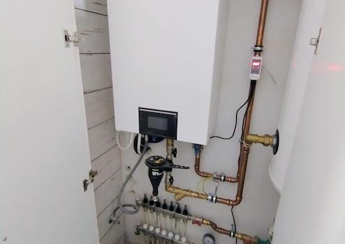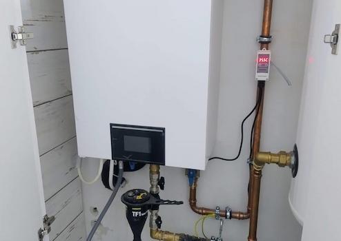 Für Warmwasser sorgt ein neuer, intelligenter Boiler. Die Küchenmöbel mit integrierter Beleuchtung in der Küche sind Bestandteil des Kaufpreises.