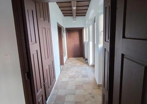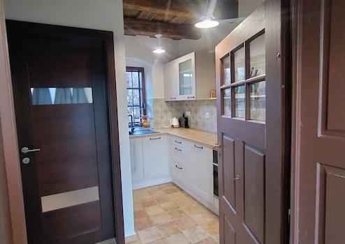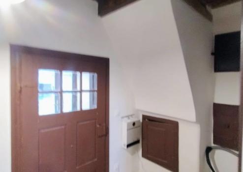 Wir betreten das Gebäude durch einen Eingang, der an die Elemente des Wachhauses erinnert. Der Flur öffnet sich zu zwei Räumen mit separaten Eingängen, die derzeit als Schlafzimmer und Wohnzimmer dienen. Vom Flur aus sind auch Küche, Bad, WC und der Dachbodenzugang erreichbar.