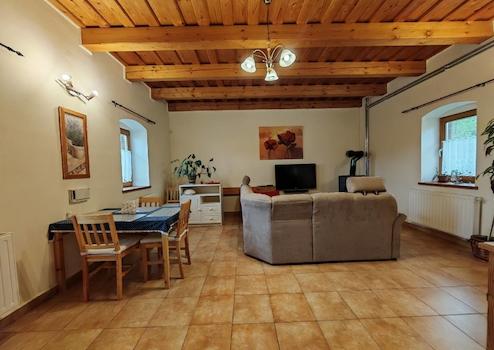 Zum Verkauf steht ein Objekt mit einer Wohnfläche von 135 m², gelegen auf einem 3037 m² großen Grundstück, am Waldrand, am ruhigen Ortsende. Das Hauptgebäude wurde 2008 komplett renoviert: Auf 71 m² befinden sich ein Wohn-Esszimmer mit amerikanischer Küche, zwei Zimmer, ein geräumiges Badezimmer, eine separate Toilette und ein Flur. Für Heizung und Warmwasser sorgt ein Gaskessel, die Heizungsanlage wird aber auch durch einen Holzkamin ergänzt.