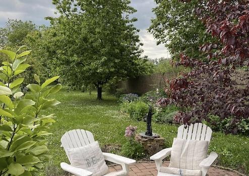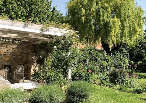 Die aktuelle Gestaltung des Gartens wurde 2018 erstellt. Bepflanzt mit mehrjährigen Pflanzen, darunter fast 50 Rosen, Pfingstrosen, Hortensien und Lavendelbüsche, die sowohl aus einem gebohrten als auch einem gegrabenen Brunnen bewässert werden können. Im Garten befinden sich außerdem 4 Hochbeete, sowie Obstbäume (verschiedene Sorten Äpfel, Pflaumen, Sauerkirschen, Kirschen, Birnen, Pfirsiche, Feigen), Johannisbeeren, Himbeeren und Stachelbeersträucher. Für die der Jahres- und Tageszeit entsprechende Entspannung im Freien steht ein ca. Eine 22 m2 große Terrasse, ein Filagory und eine Pergola mit Weinreben bieten hierfür die Möglichkeit. Diese sind alle auch mit Strom versorgt. Im hinteren Teil des eingezäunten Gartens sorgen Schatten spendende Walnussbäume auch bei Sommerhitze für das richtige Klima und umgeben ein hübsches kleines Holzhaus, das wir derzeit als Gartenabstellraum nutzen, das aber auf Wunsch auch in ein Sommerhaus umgebaut werden kann, da es auch über Strom verfügt. Der hinterste Teil des Grundstücks kann nach Ermessen des neuen Eigentümers auch für die Tierhaltung genutzt werden.