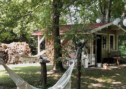 A bekerített kert hátsó szakaszában árnyas diófák biztosítják a nyári kánikulában is a megfelelő klímát, körülölelve egy kedves kis faházat, melyet jelenleg kerti tárolóként használunk, de igény szerint akár nyári lakká is alakítható, mivel szintén áramosítva van.