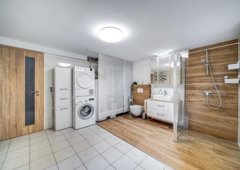 A ház három fürdőszobával rendelkezik, melyek mindegyike magas minőségű burkolattal van ellátva. A fűtésről kondenzációs gázkazán gondoskodik, a nyári hőséget pedig hűtő-fűtő klíma enyhíti, így az év minden szakában kellemes hőmérsékletet biztosít. Az ingatlan padlófűtéssel és radiátoros fűtéssel egyaránt rendelkezik, amely további kényelmet és hatékonyságot nyújt a hidegebb hónapokban