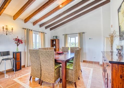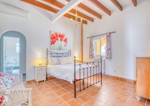 Im Erdgeschoss befinden sich drei geräumige Schlafzimmer, zwei En-Suite-Badezimmer und ein weiteres Gemeinschaftsbad. Die Verwendung hochwertiger traditioneller mallorquinischer Materialien wie Holzbalken, Sandstein und mediterrane Fliesen verleiht dem Anwesen einen rustikalen, gleichzeitig eleganten Charme. Alle Schlafzimmer sind mit individuell regulierbarer Klimaanlage sowie Zentralheizung ausgestattet, sodass zu jeder Jahreszeit ein angenehmes Raumklima gewährleistet ist.