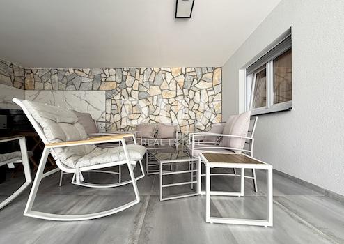 Wir verkaufen eine sehr interessante und geräumige Dreizimmerwohnung, in einem Neubau. Diese komplett möblierte 154 Quadratmeter große Wohnung klingt nach einer außergewöhnlichen Immobilie. Fläche: 154 m² Schlafzimmer: 3 (jedes mit eigenem Bad) Zwei Schlafzimmer mit Doppelbetten Ein Schlafzimmer mit einem Doppelbett und einem kleineren Bett Zusätzliches Badezimmer: 1 (mit Toilette und Waschmaschine) Zimmerausstattung: Klimaanlage und Flachbildfernseher Wohnzimmer: Groß mit Klimaanlage und Flachbildfernseher Ausziehbarer Sitzbereich Esszimmer und Küche: voll ausgestattet (einschließlich großem Kühlschrank und Geschirrspüler) Terrasse/Wellnessbereich: Umzäunt mit eigener Klimaanlage Sitzbereich Whirlpool für 6 Personen Tischfußball Zugang zum Außenpool Außenbereich: Swimmingpool, Terrasse, Außendusche, kleiner Olivenhain, Blumengarten und Treppe (Gesamtfläche 151 m²) Parken: 2 Parkplätze Ein sehr interessantes und bemerkenswertes Objekt.