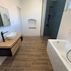 Die Badezimmer repräsentieren klare Modernität und Eleganz: Ein geräumiges, helles Badezimmer bietet Komfort, während eines der Schlafzimmer über eine eigene Dusche verfügt. Für den Komfort der Gäste gibt es neben dem Flur eine Toilette mit offener Dusche.