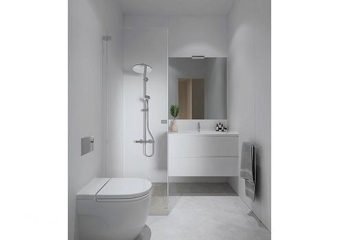 Das Badezimmer ist schlicht und elegant gestaltet. Die klaren Linien und die Verwendung von Glas und Keramik schaffen ein Gefühl von Reinheit und Frische. Der Raum ist so konzipiert, dass er sowohl funktional als auch ästhetisch ansprechend ist, was den täglichen Gebrauch angenehm macht.