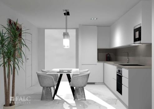 Der Wohn- und Essbereich ist offen gestaltet und bietet ausreichend Platz für gemeinsame Familienaktivitäten. Die Küche ist modern und funktional ausgestattet, mit eleganten Holzfronten und hochwertigen Geräten, die das Kochen zum Vergnügen machen. Der angrenzende Essbereich ist perfekt für gemeinsame Mahlzeiten und bietet einen direkten Zugang zum Balkon, der an sonnigen Tagen als zusätzlicher Wohnraum genutzt werden kann.