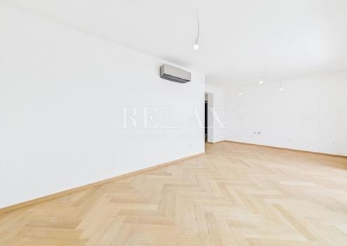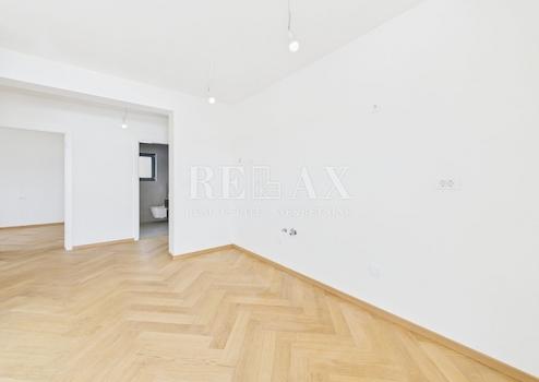 Das Interieur ist auf Qualität und Ästhetik ausgerichtet – die Böden sind mit Fischgrätparkett ausgelegt, während Bad und Terrasse mit rutschfesten Keramikfliesen ausgestattet sind. Aluminiumfenster mit Rollläden, weiß lackierte Innentüren, eine einbruchsichere Eingangstür und eine Video-Gegensprechanlage mit Fernentriegelung unterstreichen das Sicherheits- und Funktionsniveau zusätzlich.