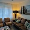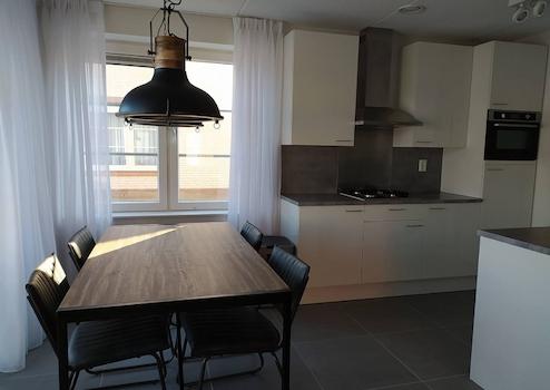 Durch den Eingang betreten Sie einen geräumigen Flur, der Zugang zum Zählerschrank, der Toilette, der Treppe und dem L-förmigen Wohnzimmer bietet. Das helle und geräumige Wohnzimmer mit Schiebetüren/Schiebefenster zur Terrasse ist zur Küche hin offen. Im Wohnzimmer finden Sie eine Kombination aus Leder, Holz und Schwarz, die für einen coolen Look sorgt. Die moderne Küche ist mit allen notwendigen und integrierten Geräten ausgestattet. Angrenzend an die Küche befindet sich ein Hauswirtschaftsraum mit Waschmaschine und Trockner. Schließlich gibt es noch einen geräumigen Abstellraum für den Eigentümer, der nur dem Eigentümer zugänglich ist (bei Anmietung des Hauses).