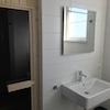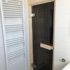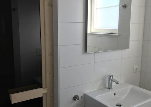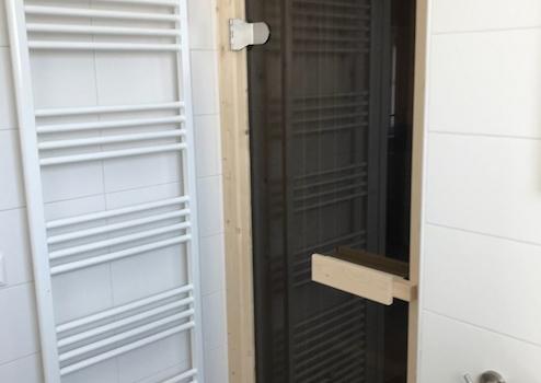 Das geräumige Badezimmer verfügt über ein Waschbecken, eine Dusche und eine Toilette. Dieses Badezimmer bietet auch Zugang zu einer Sauna (Infrarot).
