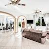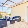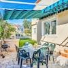 Vom Wohnzimmer aus gelangt man über ein paar Stufen auf die Liegewiese mit Swimmingpool. Wenn es in der Sonne zu heiß wird, gibt es eine ausfahrbare Markise als Überdachung, die einen schattigen Bereich von etwa 30 m² bietet.
