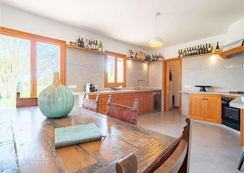 Zwischen Haupthaus und Nebengebäude befindet sich ein großer, flexibel nutzbarer Raum, ideal für Retreats, Hobbys oder Veranstaltungen. Das zweite Wohngebäude umfasst mehrere Schlafzimmer, Bäder und eine voll ausgestattete Küche. Ein besonderes Highlight ist die darunter gelegene, komplett eingerichtete Bodega, die die Möglichkeit zur hauseigenen Weinproduktion bietet.