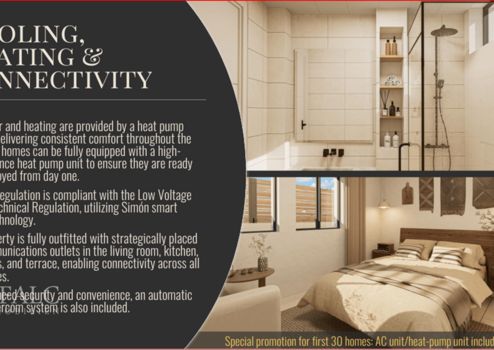 Warmwasser und Heizung werden von einer Wärmepumpe bereitgestellt. Die Häuser können komplett mit einer Hochleistungs-Wärmepumpenanlage ausgestattet werden.