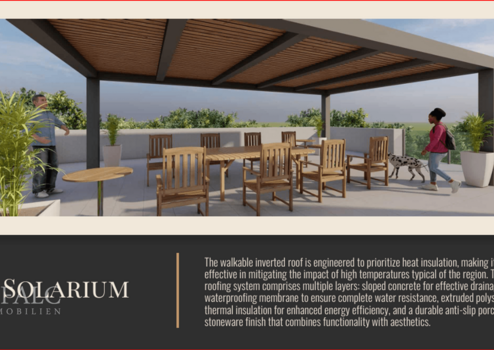die Auswirkungen der hohen Temperaturen, die für die Region typisch sind, sehr effektiv abzumildern. Das Dachsystem besteht aus mehreren Schichten: geneigter Beton für eine effektive Entwässerung, eine