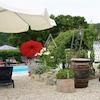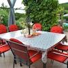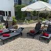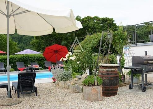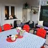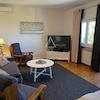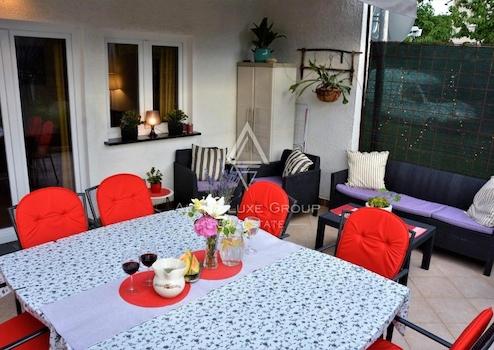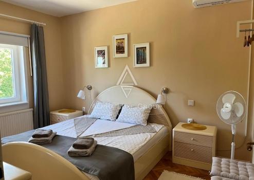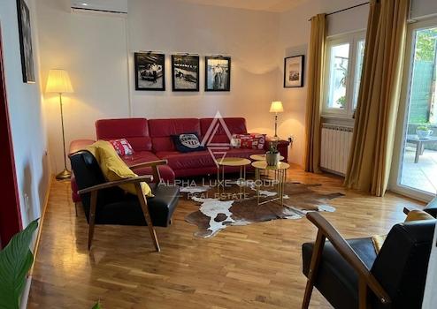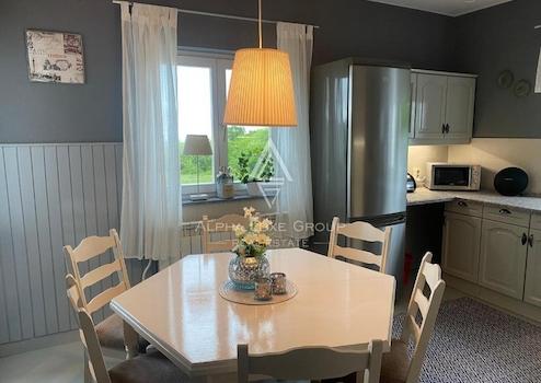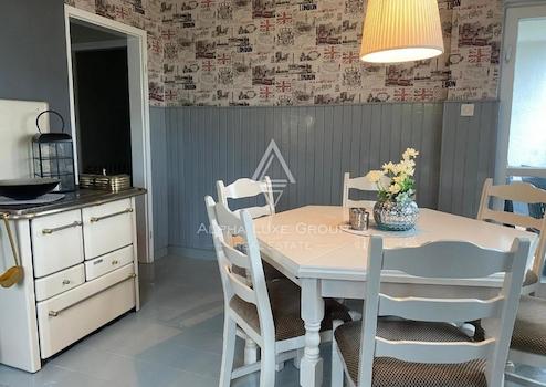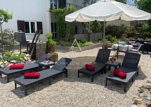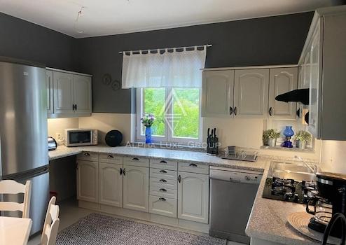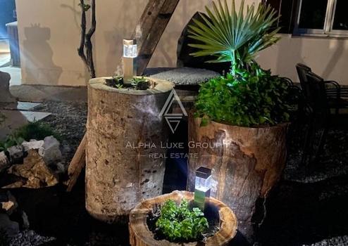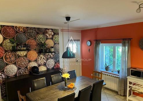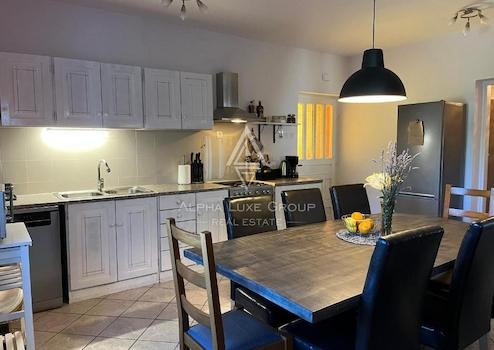 Das Haupthaus umfasst 200 m² und ist in zwei unabhängige Wohnungen aufgeteilt. Im Erdgeschoss befindet sich eine einladende Wohnung mit Eingangsbereich, Gäste-WC, voll ausgestatteter Küche mit Essbereich sowie einem geräumigen Wohnzimmer mit Zugang zur großzügigen Terrasse. Außerdem gibt es ein Schlafzimmer mit eigenem Bad sowie eine integrierte Garage.