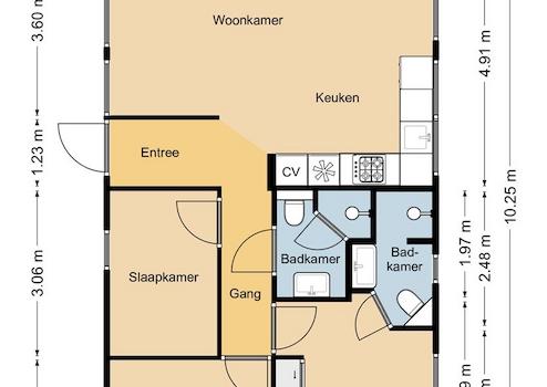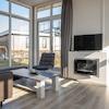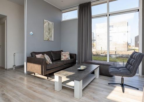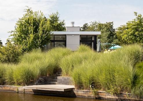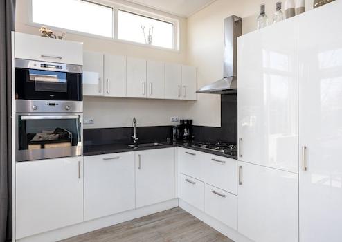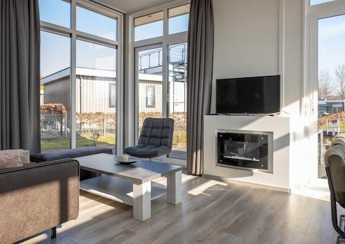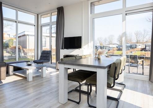Das Wohnzimmer befindet sich auf der Rückseite und bietet einen schönen Blick auf das Wasserspiel und Ihren eigenen Steg. Darüber hinaus verfügt das Wohnzimmer über viel Licht und Schiebetüren. Zentral im Wohnzimmer befindet sich ein schöner Gaskamin.