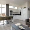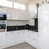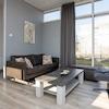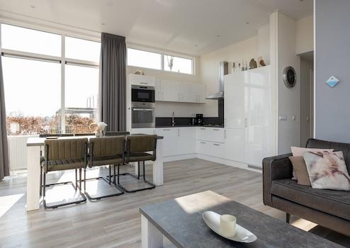 Die offene Küche grenzt direkt an das Wohnzimmer. Dieses befindet sich in einer geräumigen und neutralen Eckeinheit. Es stehen verschiedene Einbaugeräte zur Verfügung, darunter ein Backofen, eine Mikrowelle, ein Geschirrspüler, ein Kühlschrank, eine Gefriertruhe und ein Gasherd.
