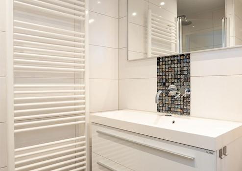 Das Hauptschlafzimmer verfügt über ein eigenes Badezimmer mit ebenerdiger Dusche, Toilette und Waschbecken.