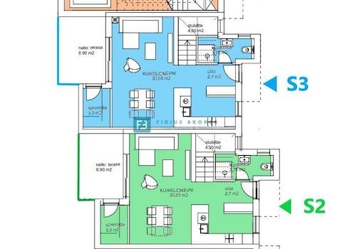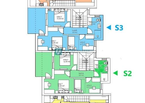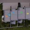Haus S2 besteht aus zwei Etagen (Erdgeschoss und erster Stock) und einem Hof ​​mit einer Gesamtfläche von 53 m2. Im Erdgeschoss gibt es einen überdachten Eingang, einen Abstellraum, ein Badezimmer, eine Küche mit Esszimmer und ein Wohnzimmer mit Zugang zu einer überdachten Terrasse. Eine Innentreppe führt in den ersten Stock, wo sich ein Flur, drei Schlafzimmer, ein Badezimmer und eine Loggia befinden.