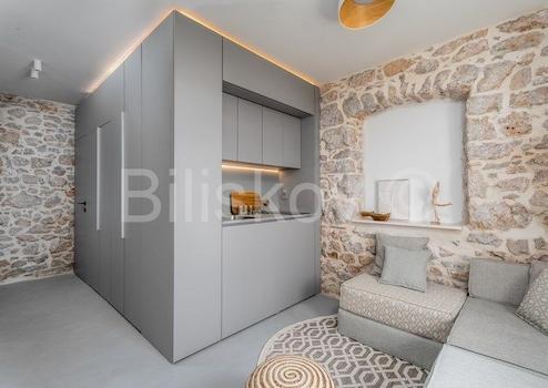 On the south side of the idyllic island of Brač, there is a harmoniously renovated stone house with 9 apartments on three floors.On the first floor there is an apartment of 18.6 m2It consists of a kitchen with a living and sleeping area and a bathroomThe apartment of 18.6 m2 is characterized by: